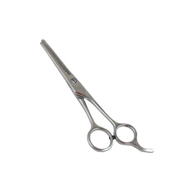 Die einseitige Effilierschere deluxe eignet sich zum Ausdünnen und Stylen des Fells. Stark verfilzte Haare können mit entsprechender Sorgfalt geschnitten werden.